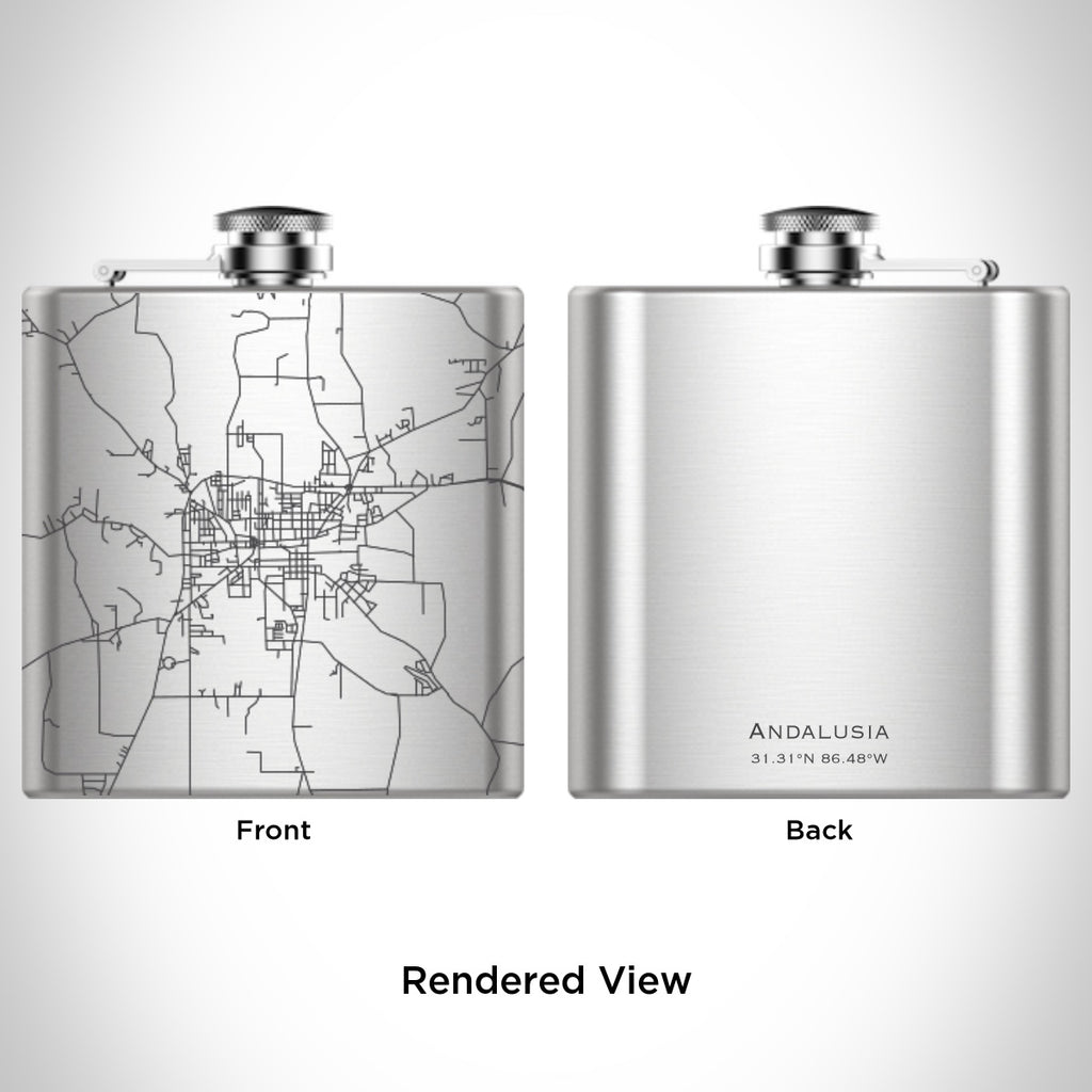 Custom engraved map of Andalusia, Alabama and coordinates on 6oz hip flask. Includes canvas bag and funnel. Measurement - 5in x 1in x 4in.
