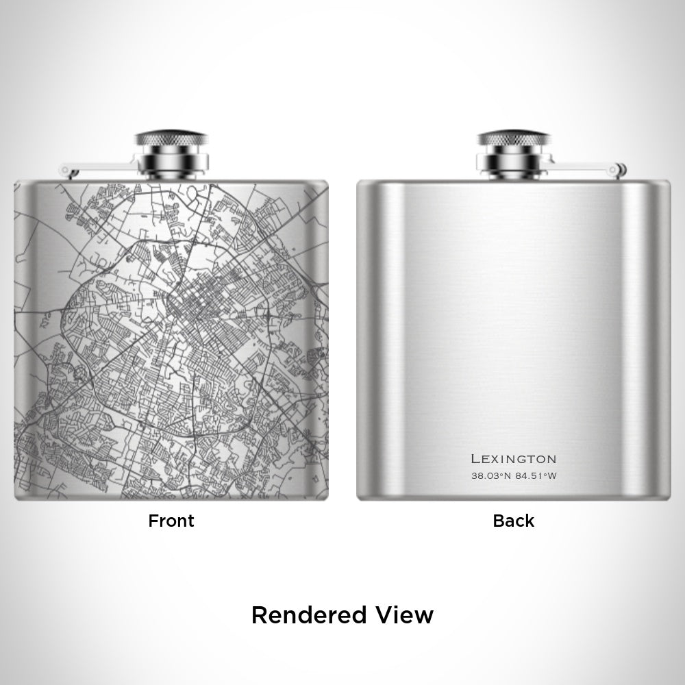 Custom engraved map of Lexington, Kentucky and coordinates on 6oz hip flask. Includes canvas bag and funnel. Measurement - 5in x 1in x 4in.