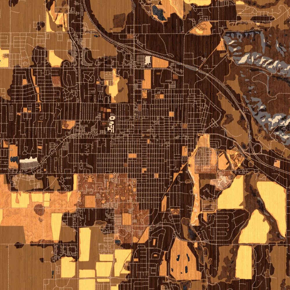 Custom map print of Bozeman, Montana featuring our ember style inspired by natural wood grains. Each print is expertly printed on museum quality matte paper. Choose from 3 different sizes in either portrait or landscape orientations.