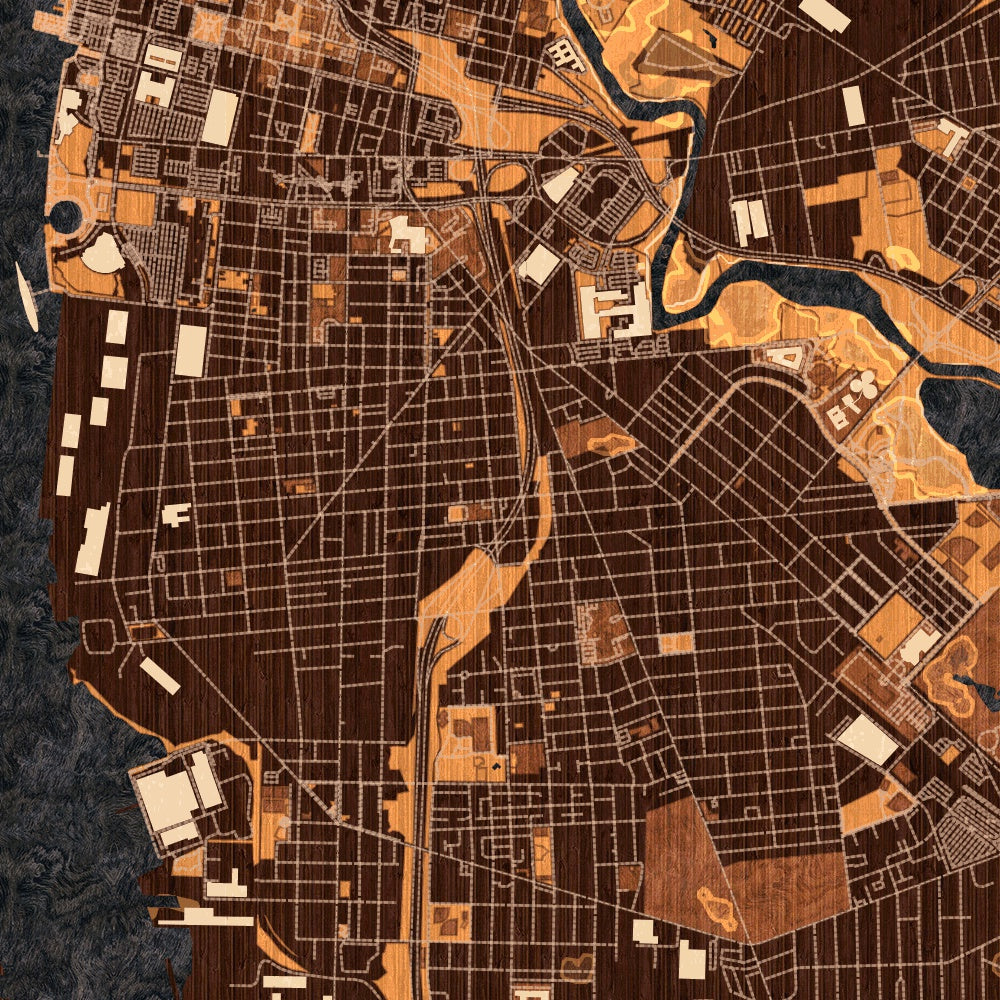 Custom map print of Camden, New Jersey featuring our ember style inspired by natural wood grains. Each print is expertly printed on museum quality matte paper. Choose from 3 different sizes in either portrait or landscape orientations.