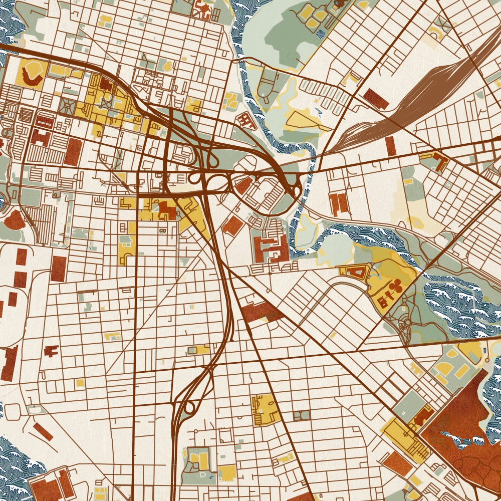 Custom map print of Camden, New Jersey featuring our woodblock style inspired by traditional Japanese woodblock art. Each print is expertly printed on museum quality matte paper. Choose from 3 different sizes in either portrait or landscape orientations.
