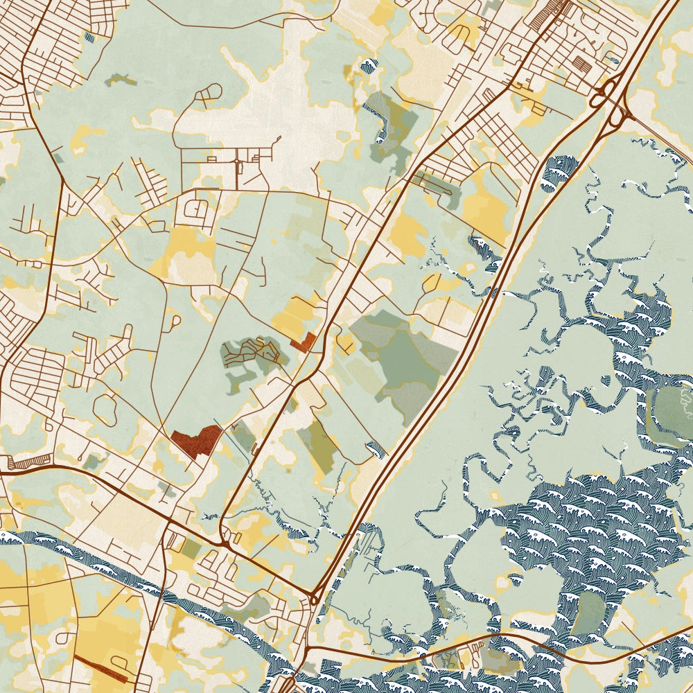 Custom map print of Cape May, New Jersey featuring our woodblock style inspired by traditional Japanese woodblock art. Each print is expertly printed on museum quality matte paper. Choose from 3 different sizes in either portrait or landscape orientations.