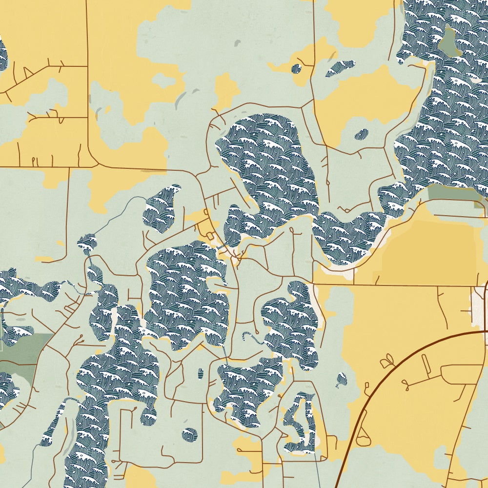Custom map print of Chain O' Lakes-King, Wisconsin featuring our woodblock style inspired by traditional Japanese woodblock art. Each print is expertly printed on museum quality matte paper. Choose from 3 different sizes in either portrait or landscape orientations.