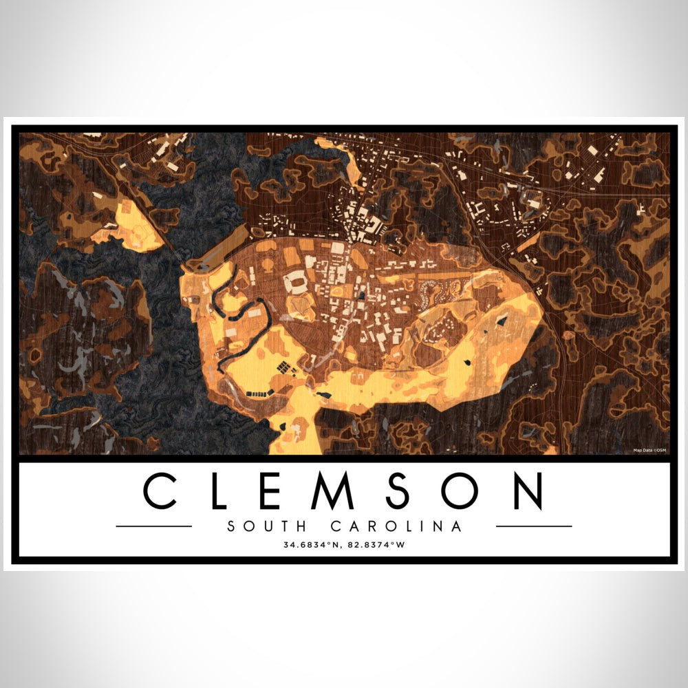 Custom map print of Clemson, South Carolina featuring our ember style inspired by natural wood grains. Each print is expertly printed on museum quality matte paper. Choose from 3 different sizes in either portrait or landscape orientations.