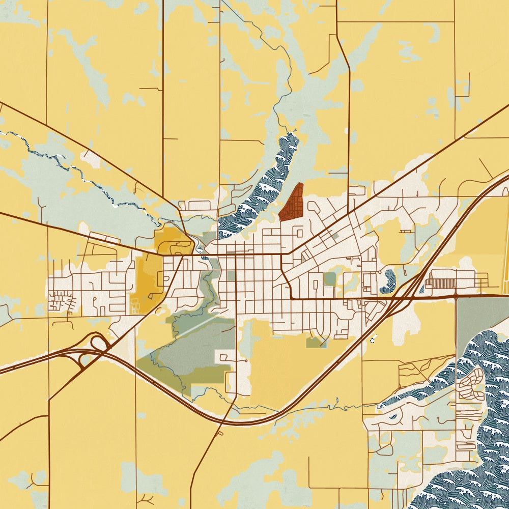 Custom map print of Delavan, Wisconsin featuring our woodblock style inspired by traditional Japanese woodblock art. Each print is expertly printed on museum quality matte paper. Choose from 3 different sizes in either portrait or landscape orientations.