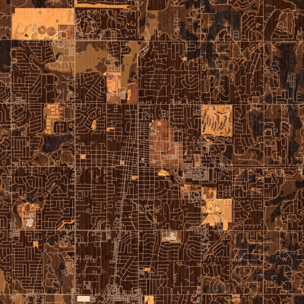 Custom map print of Edmond, Oklahoma featuring our ember style inspired by natural wood grains. Each print is expertly printed on museum quality matte paper. Choose from 3 different sizes in either portrait or landscape orientations.