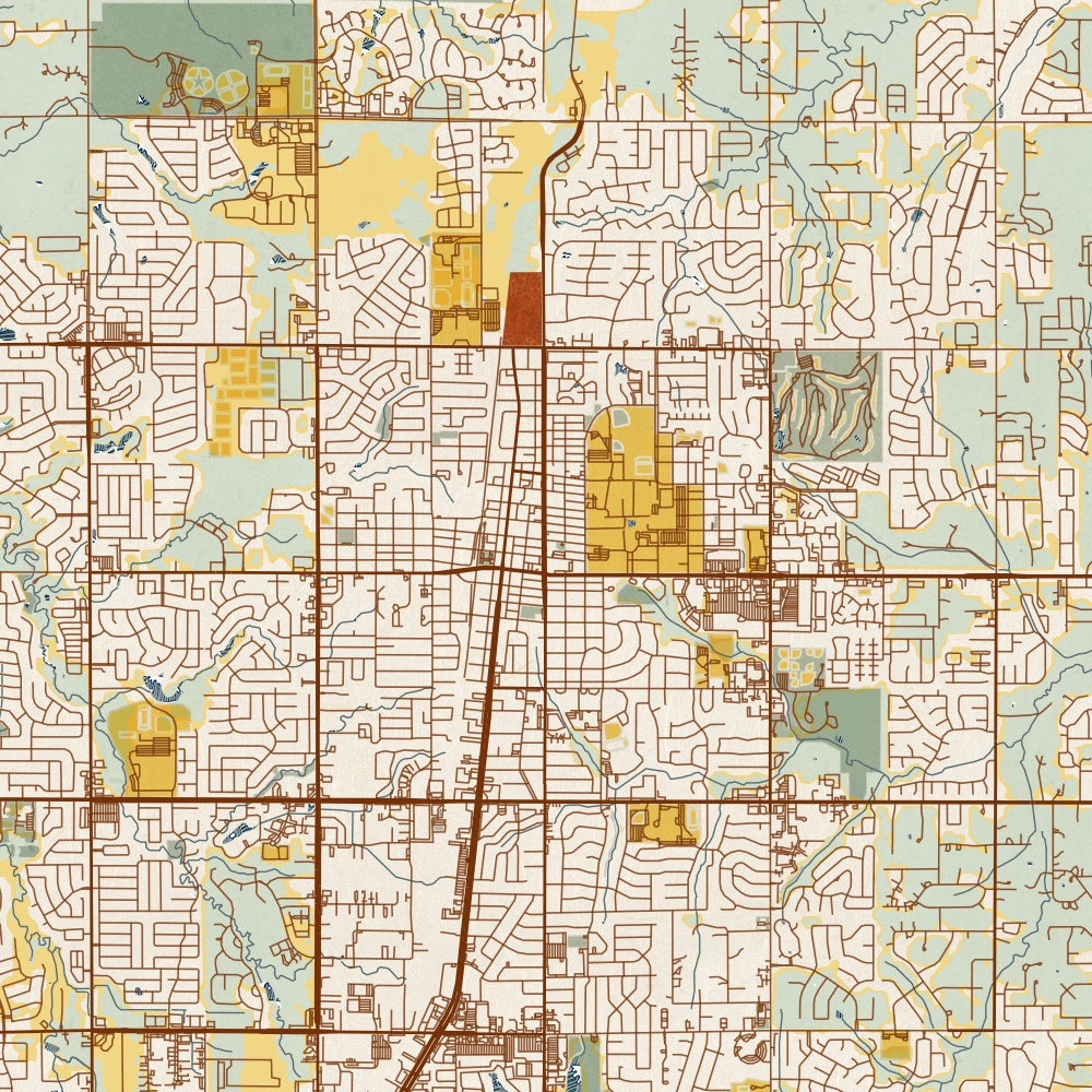 Custom map print of Edmond, Oklahoma featuring our woodblock style inspired by traditional Japanese woodblock art. Each print is expertly printed on museum quality matte paper. Choose from 3 different sizes in either portrait or landscape orientations.