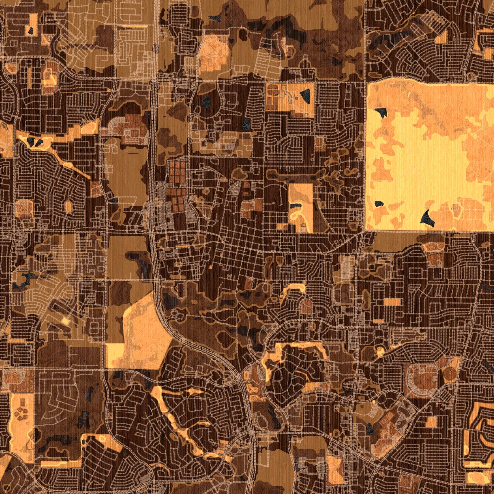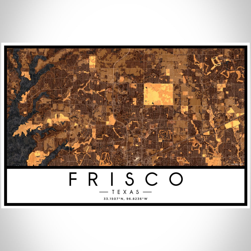 Custom map print of Frisco, Texas featuring our ember style inspired by natural wood grains. Each print is expertly printed on museum quality matte paper. Choose from 3 different sizes in either portrait or landscape orientations.