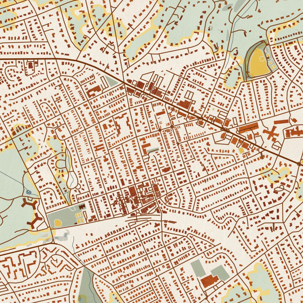 Custom map print of Narberth, Pennsylvania featuring our woodblock style inspired by traditional Japanese woodblock art. Each print is expertly printed on museum quality matte paper. Choose from 3 different sizes in either portrait or landscape orientations.