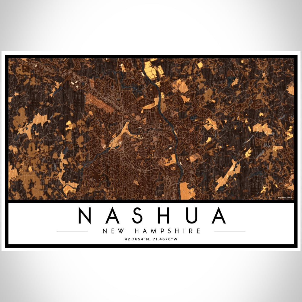 Custom map print of Nashua, New Hampshire featuring our ember style inspired by natural wood grains. Each print is expertly printed on museum quality matte paper. Choose from 3 different sizes in either portrait or landscape orientations.