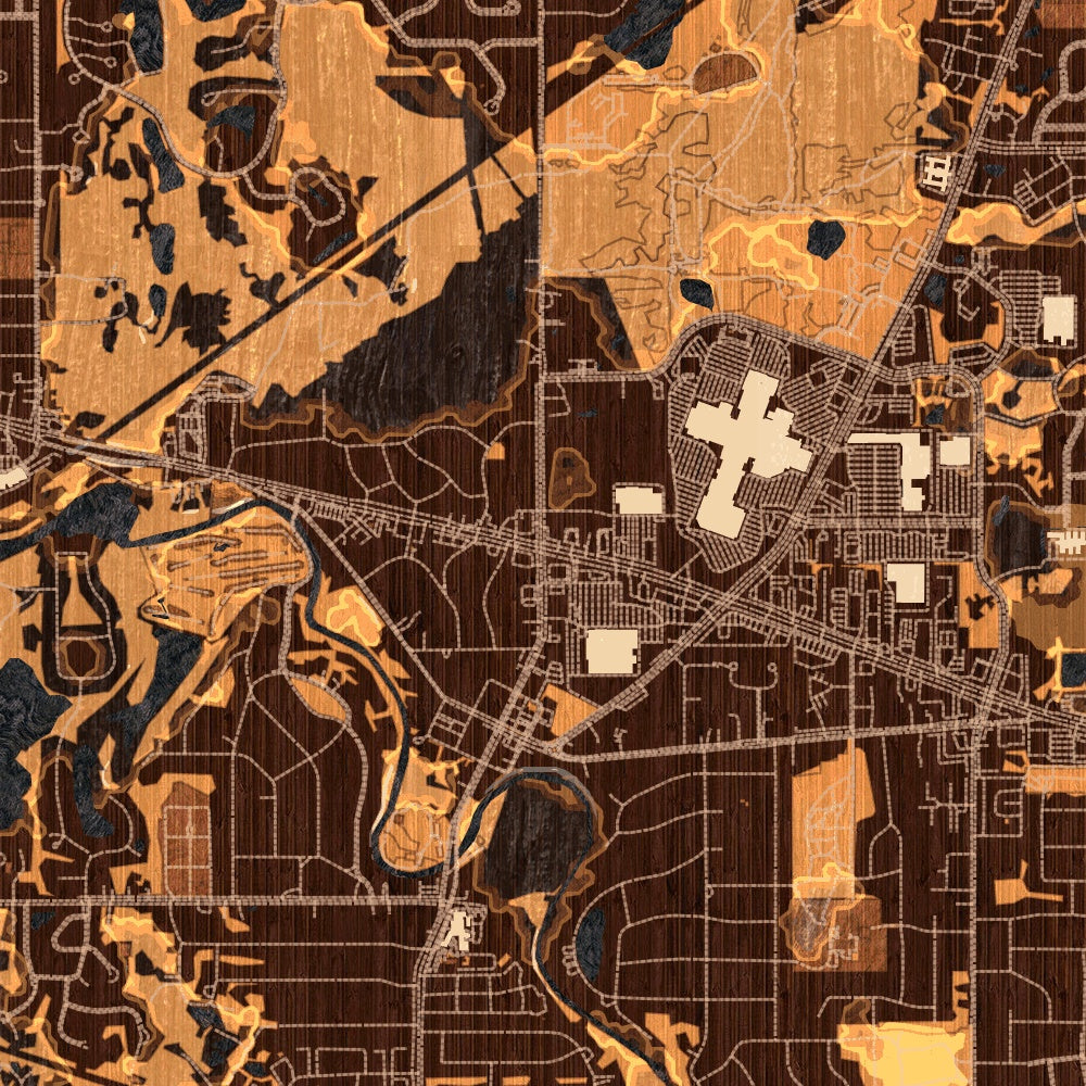 Custom map print of Okemos, Michigan featuring our ember style inspired by natural wood grains. Each print is expertly printed on museum quality matte paper. Choose from 3 different sizes in either portrait or landscape orientations.