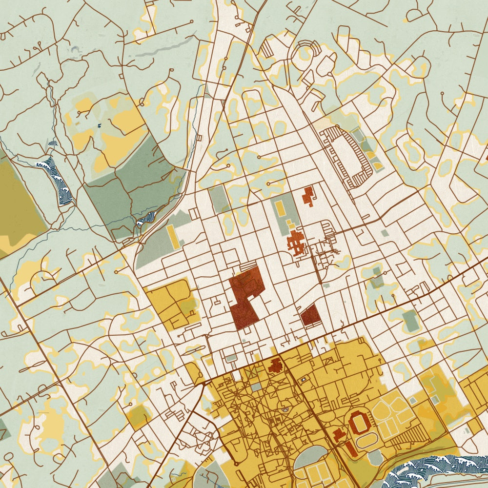 Custom map print of Princeton, New Jersey featuring our woodblock style inspired by traditional Japanese woodblock art. Each print is expertly printed on museum quality matte paper. Choose from 3 different sizes in either portrait or landscape orientations.