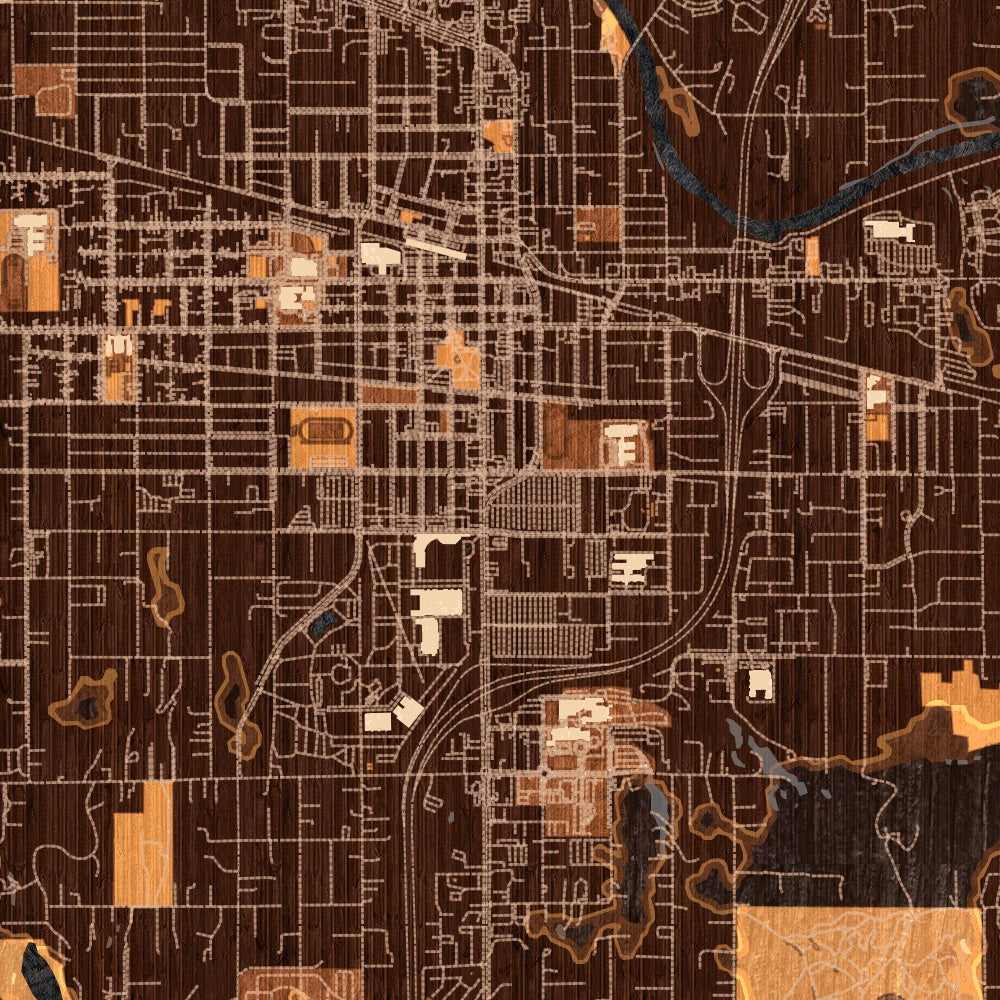 Custom map print of Puyallup, Washington featuring our ember style inspired by natural wood grains. Each print is expertly printed on museum quality matte paper. Choose from 3 different sizes in either portrait or landscape orientations.