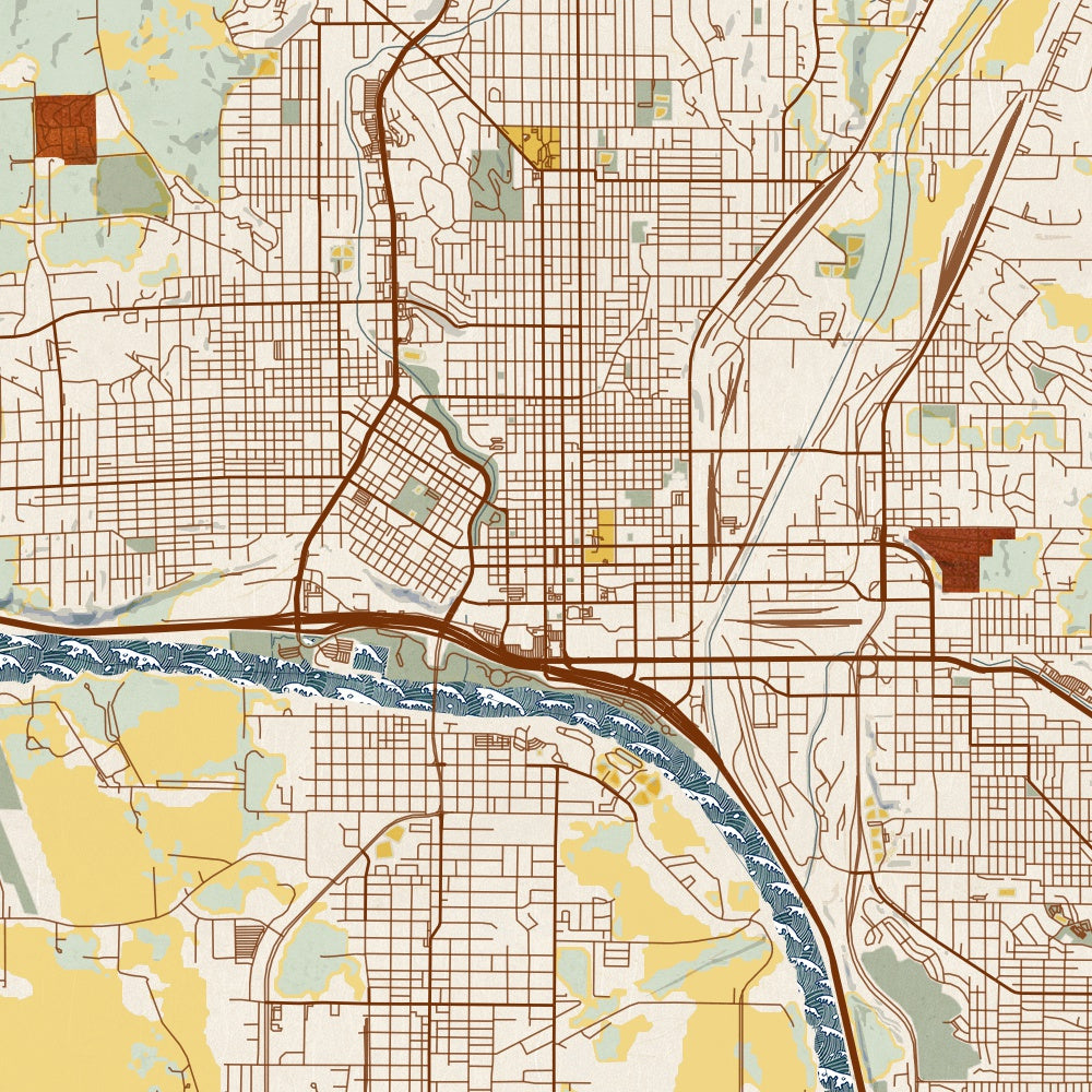 Custom map print of Sioux City, Iowa featuring our woodblock style inspired by traditional Japanese woodblock art. Each print is expertly printed on museum quality matte paper. Choose from 3 different sizes in either portrait or landscape orientations.