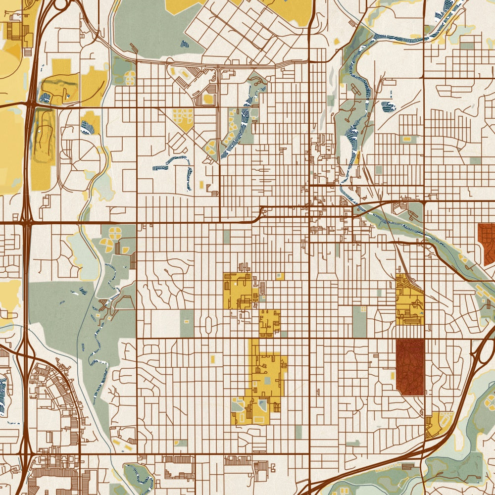 Custom map print of Sioux Falls, South Dakota featuring our woodblock style inspired by traditional Japanese woodblock art. Each print is expertly printed on museum quality matte paper. Choose from 3 different sizes in either portrait or landscape orientations.