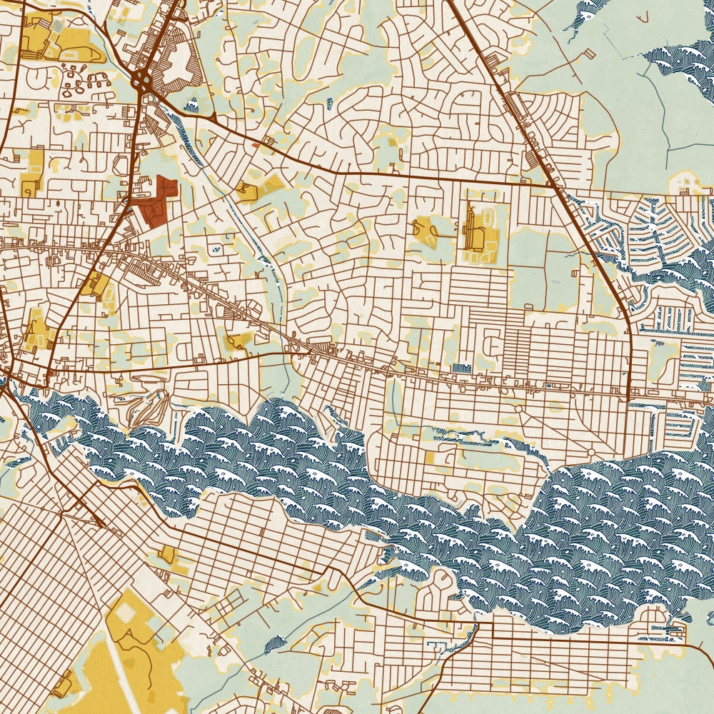 Custom map print of Toms River, New Jersey featuring our woodblock style inspired by traditional Japanese woodblock art. Each print is expertly printed on museum quality matte paper. Choose from 3 different sizes in either portrait or landscape orientations.