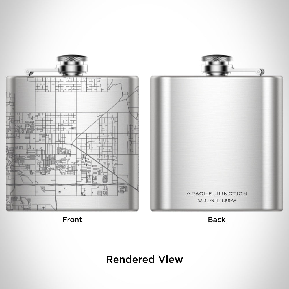 Custom engraved map of Apache Junction, Arizona and coordinates on 6oz hip flask. Includes canvas bag and funnel. Measurement - 5in x 1in x 4in.