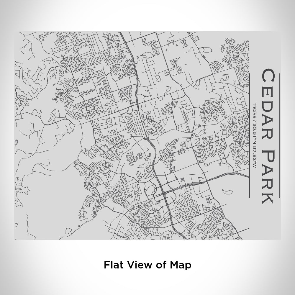 Custom engraved map of Cedar Park, Texas and coordinates on 20oz double walled insulated stainless steel bottle with bamboo top. Measurement - 4in x 4in x 12in.