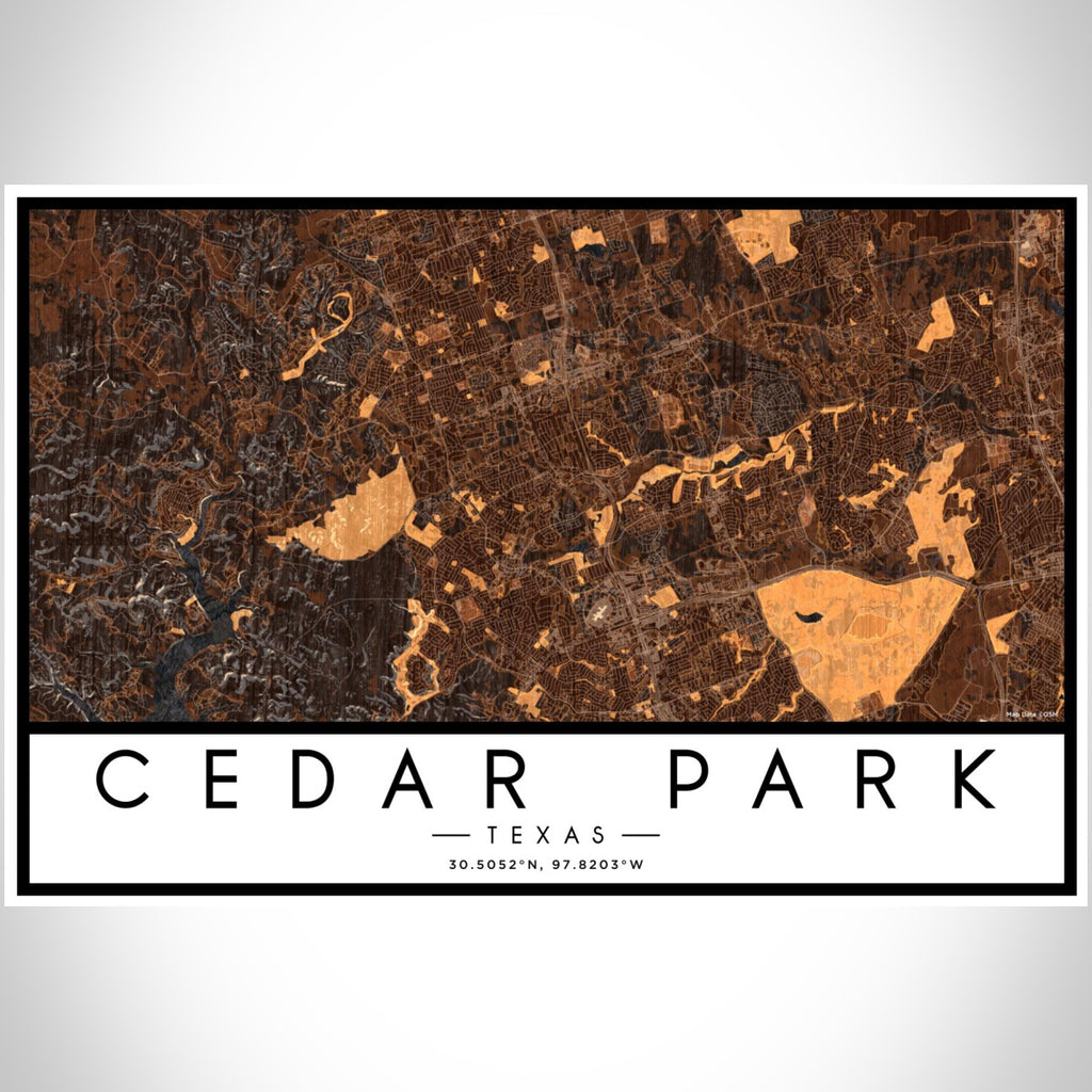 Custom map print of Cedar Park, Texas featuring our ember style inspired by natural wood grains. Each print is expertly printed on museum quality matte paper. Choose from 3 different sizes in either portrait or landscape orientations.