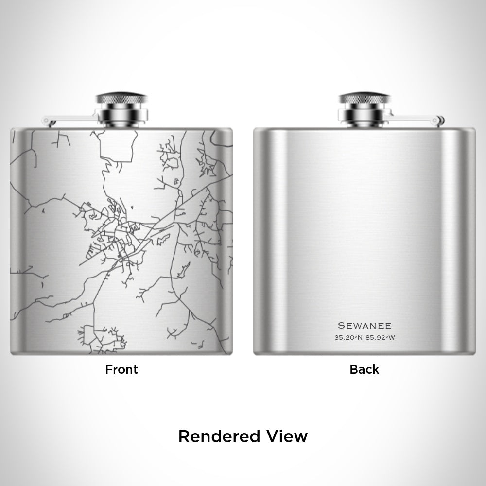 Custom engraved map of Sewanee, Tennessee and coordinates on 6oz hip flask. Includes canvas bag and funnel. Measurement - 5in x 1in x 4in.
