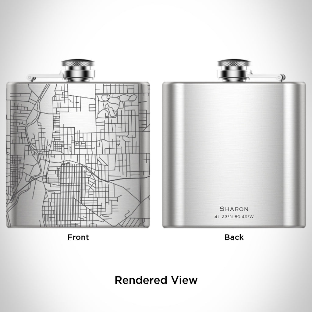 Custom engraved map of Sharon, Pennsylvania and coordinates on 6oz hip flask. Includes canvas bag and funnel. Measurement - 5in x 1in x 4in.