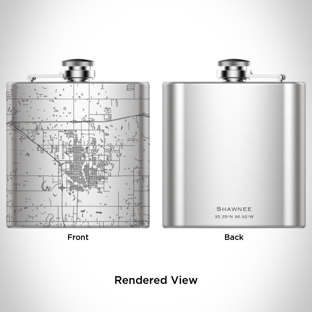 Custom engraved map of Shawnee, Oklahoma and coordinates on 6oz hip flask. Includes canvas bag and funnel. Measurement - 5in x 1in x 4in.