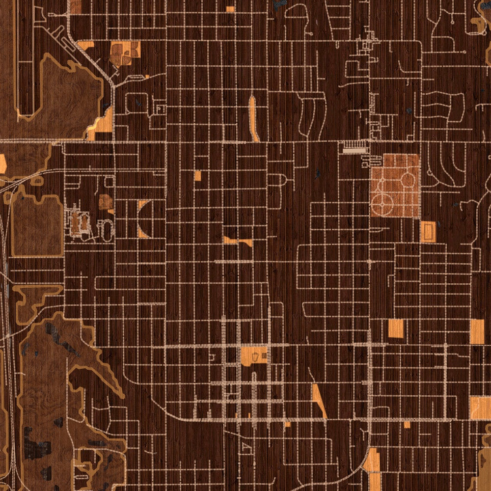 Custom map print of Shawnee, Oklahoma featuring our ember style inspired by natural wood grains. Each print is expertly printed on museum quality matte paper. Choose from 3 different sizes in either portrait or landscape orientations.