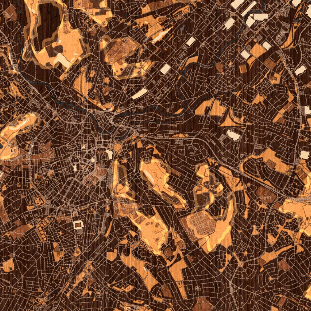 Custom map print of Sheffield, England featuring our ember style inspired by natural wood grains. Each print is expertly printed on museum quality matte paper. Choose from 3 different sizes in either portrait or landscape orientations.